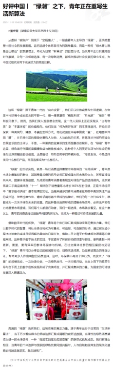 近日,我院23级思政1班学生、2025年第一期红网论道训练营学员董世慧撰写的《好评中国丨“绿潮”之下,青年正在重写生活新算法》一文在红网理论频道发表,被央广网、正义网等全国200多家主流新闻媒体网站,以及新浪网、凤凰网、搜狐网等头部平台重点转载。