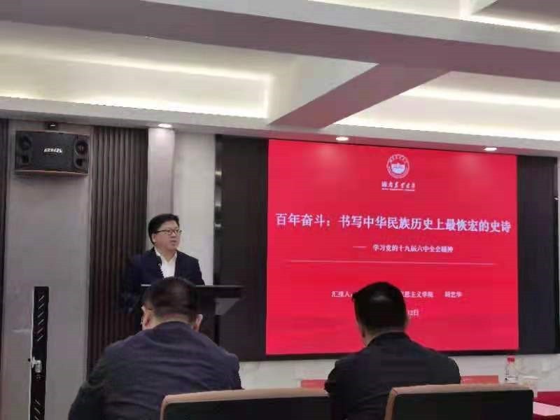 马克思主义学院院长胡艺华教授对十九届六中全会精神作了全面系统的解读。胡院长围绕“从党的百年奋斗中看清楚过去我们为什么能够成功,弄明白未来我们怎样才能继续成功”这一逻辑主线,全面阐释了党百年奋斗的四大成就、五大历史意义和十条宝贵经验。张云英副院长作了《学深、悟透、讲活:用十九届六中全会精神引领思政课教学》主题发言。她希望全体思政课教师,要将《决议》精神贯穿于思政课教学全过程,在学深悟透、入脑入心、落地生根上下功夫,讲全讲活讲透《决议》精神。希望老师们找准一个感悟点,完成一份学习报告;找准一个切入点,完成一个课题论证报告;找准一个连接点,制定一个教学方案,录制一堂高质量的宣讲课。