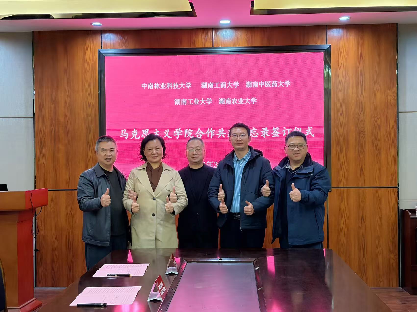(马克思主义学院 谢宇亭)3月16日,来自中南林业科技大学、湖南工商大学、湖南中医药大学、湖南工业大学等五所高校的马克思主义学院院长集聚在湖南农业大学,就马克思主义学院建设开展座谈交流,现场签订合作共建备忘录。五校马院携手搭建协同发展平台,开启资源共享、优势互补、共建共融的思政教育发展新篇章。